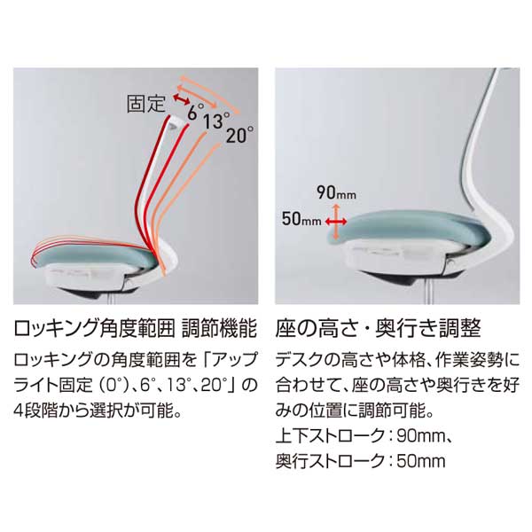 ガス圧昇降式、ポスチャーサポートシート、オートフィットシンクロロッキング、ロッキング反力 簡易調節機能(5段階)、ロッキング角度範囲 調節機能(0°、6°、13°、20°の4段階)、座高さ調節(ストローク90mm)、座奥行き調節(ストローク50mm)、ランバーサポート(メッシュタイプ/上下ストローク50mm+内外2段階)、ショルダーサポート、クリーンテクトコーティング