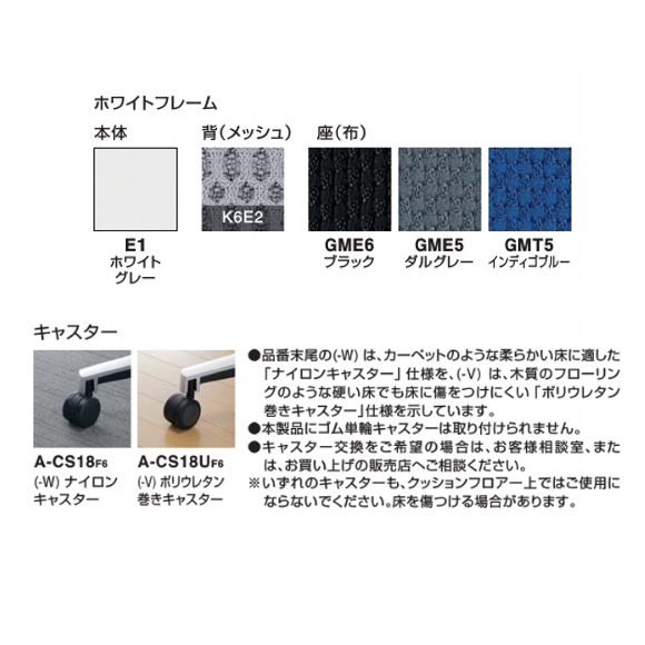 - 背 / 背枠:アルミダイカスト(磨き仕上げ)、強化ナイロン、張り地:ポリエステル弾性メッシュ、座 / 座板:強化ナイロン、PP、クッション:モールドウレタン、張り地:ポリエステル、肘/強化ナイロン、ポリウレタンスキンモールド、脚 / 脚羽根:アルミダイカスト(磨き仕上げ)、キャスター:φ60mm