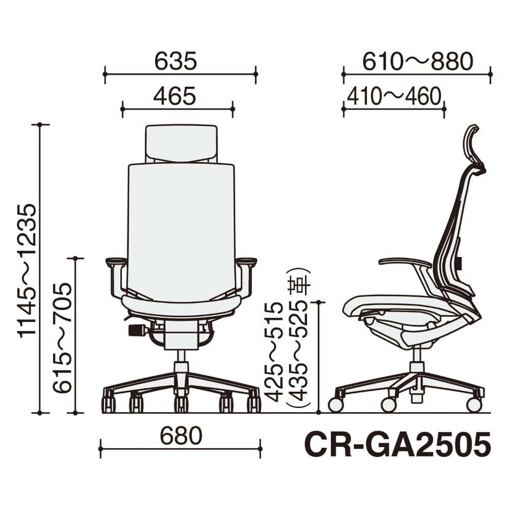 - 外寸法/幅680×奥行610~880×高さ1145~1235mm、座面寸法/幅500×奥行410~460mm、肘内寸法/幅465mm、座面高さ/435~525mm、肘高さ/615~705mm