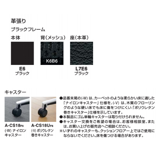 - 背 / 背枠:アルミダイカスト(磨き仕上げ)、強化ナイロン、張り地:ポリエステル弾性メッシュ、座 / 座板:強化ナイロン、PP、クッション:モールドウレタン、張り地:本革、肘/強化ナイロン、ポリウレタンスキンモールド、脚 / 脚羽根:アルミダイカスト(磨き仕上げ)、キャスター:φ60mm
