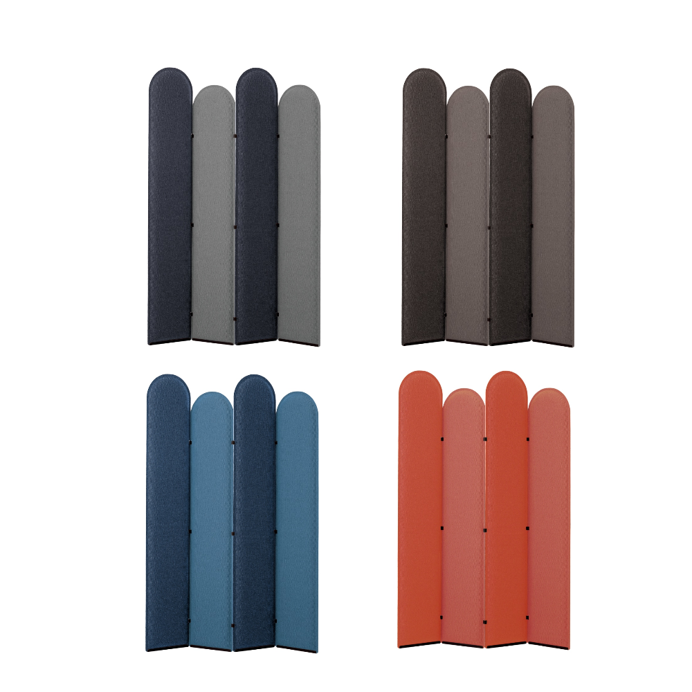 オープンミーティングの音に配慮したパネル。楽し気なデザインで会話弾むオフィス空間に。 隣り合うミーティングテーブルの間に設置した場合、吸音・遮音効果によって、パネルの反対側へ伝わる音圧を軽減します。ジャバラ置きタイプのパネルは、表と裏、隣り合わせで異なるツートンカラーです。